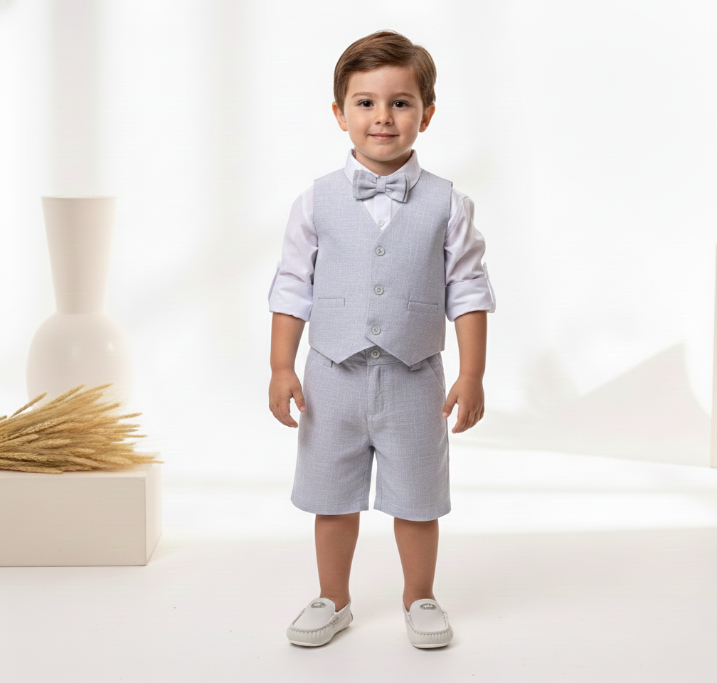 A gravata é o acessório que adiciona um toque de elegância ao traje de batizado. A gravata infantil é feito com fechamento por velcro, facilitando o processo de vestir o bebê. Ela segue no mesmo tecido da calça e colete. A coleção em tecido flamê no azul bebê é o destaque do conjunto de batizado. O tecido flamê é caracterizado por pequenos fios irregulares, proporcionando uma textura única à peça. O colete pode apresenta botões na parte frontal, bolsos decorativos e ajuste na parte de trás para um melhor caimento.