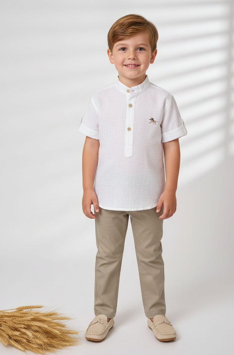 Conjunto Ravi Infantil Menino Bata Manga Curta Calça Sarja Marfim Premium