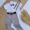 Conjunto Infantil Menino Camisa Manga Curta Calça com cinto Gravata e Suspensório Bege Premium