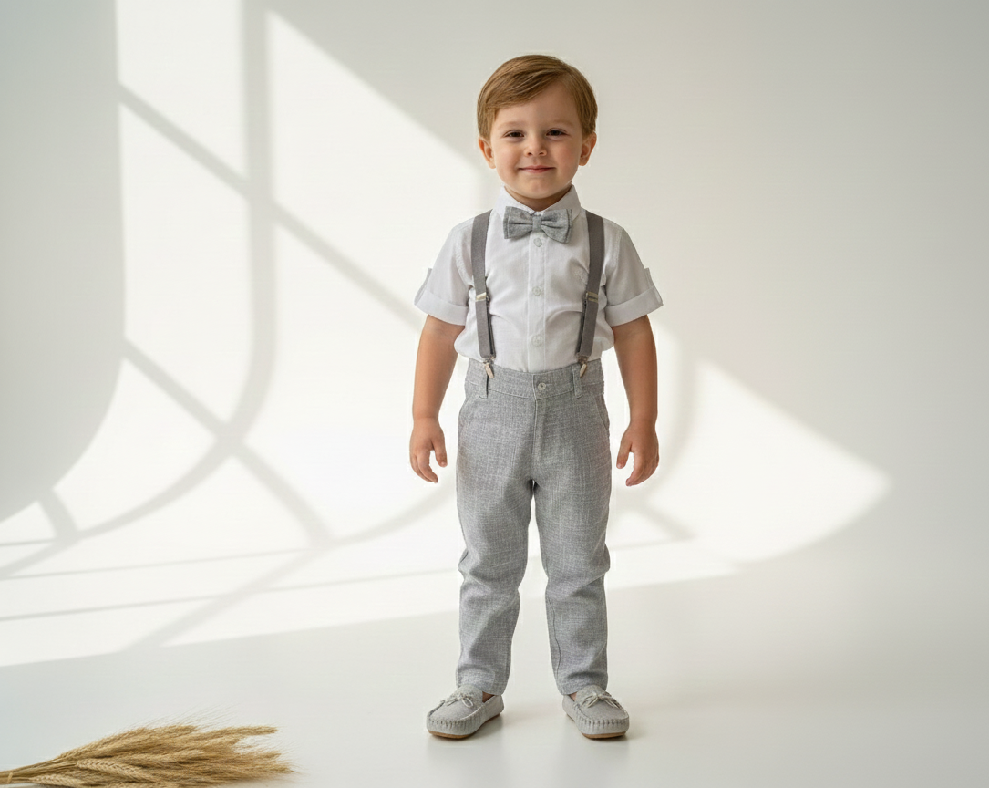 - Calça em Tecido Flamê: A calça cinza em tecido flamê de linho é leve e confortável, ideal para manter o seu pequeno estiloso e à vontade durante o evento. O tecido texturizado adiciona um toque especial, conferindo modernidade ao look.
