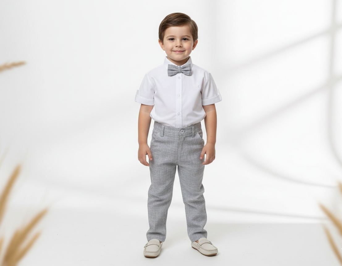 Conjunto Infantil Menino com Camisa Manga Curta Calça e Gravata Cinza em Tecido Flamê Batizado Casamento
