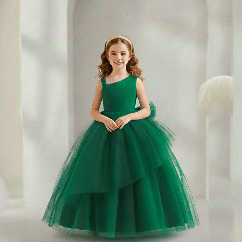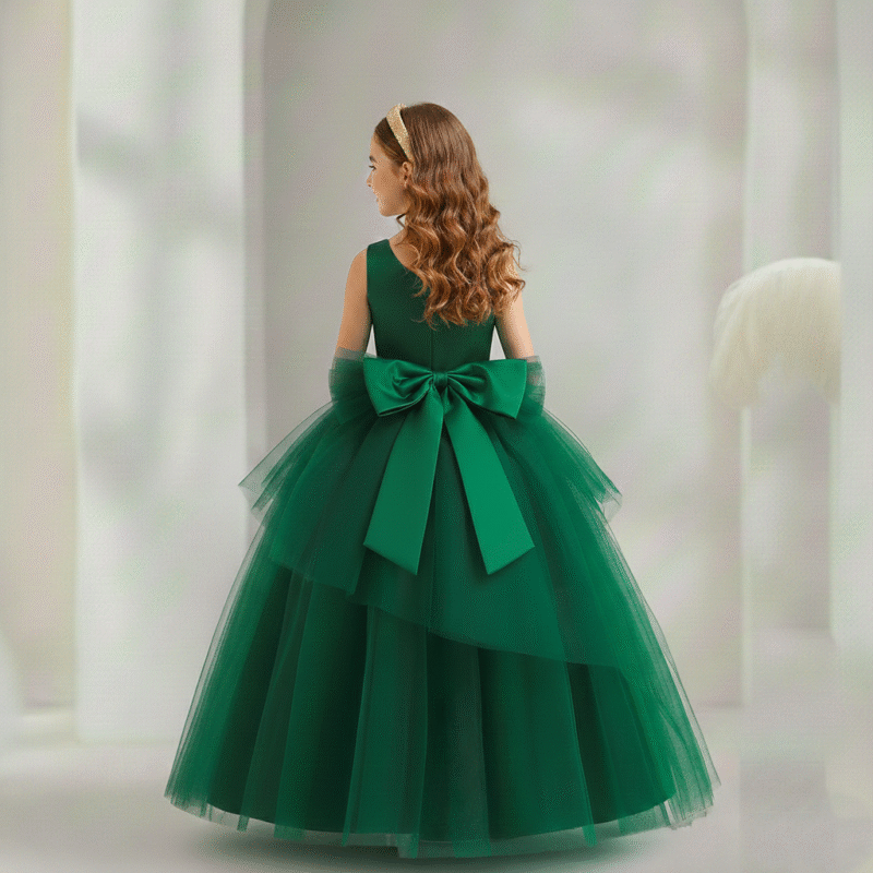 Vestido Longo de Princesa Infantil Elegante, ideal para ocasiões especiais como a festas, daminhas de honra, formatura. Este vestido verde premium luxuoso é perfeito para tornar sua pequena princesa o centro das atenções.