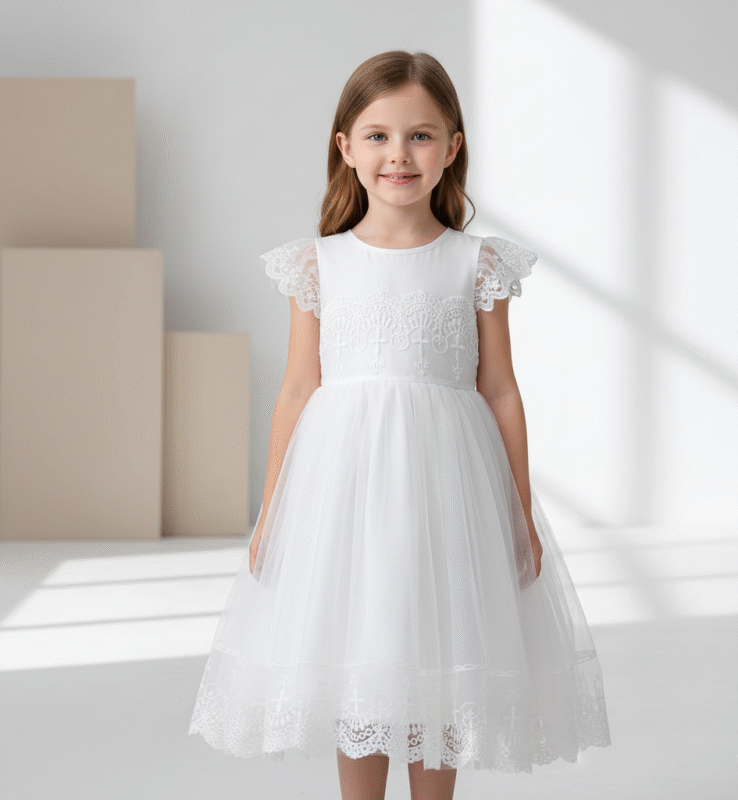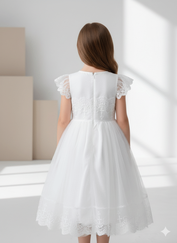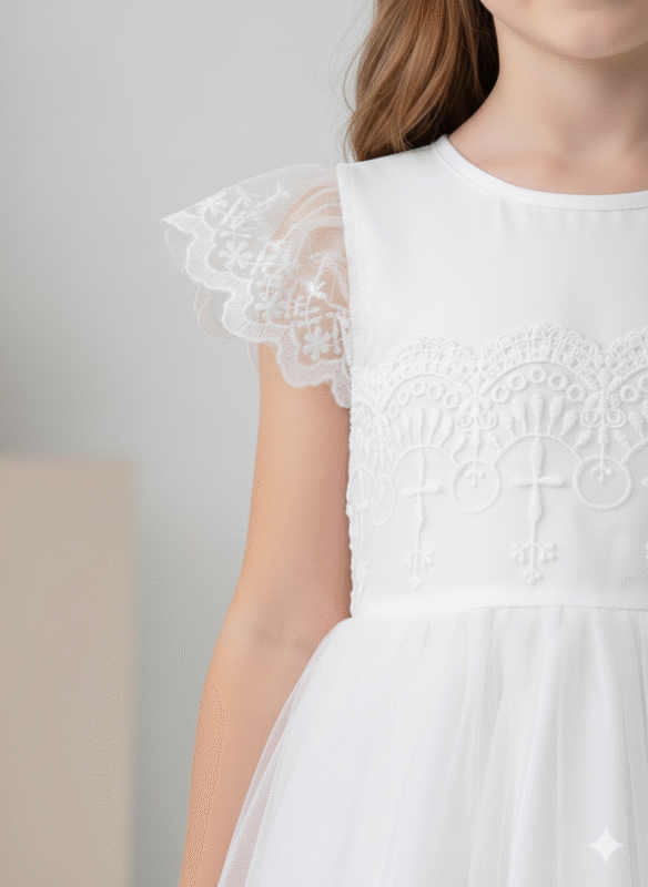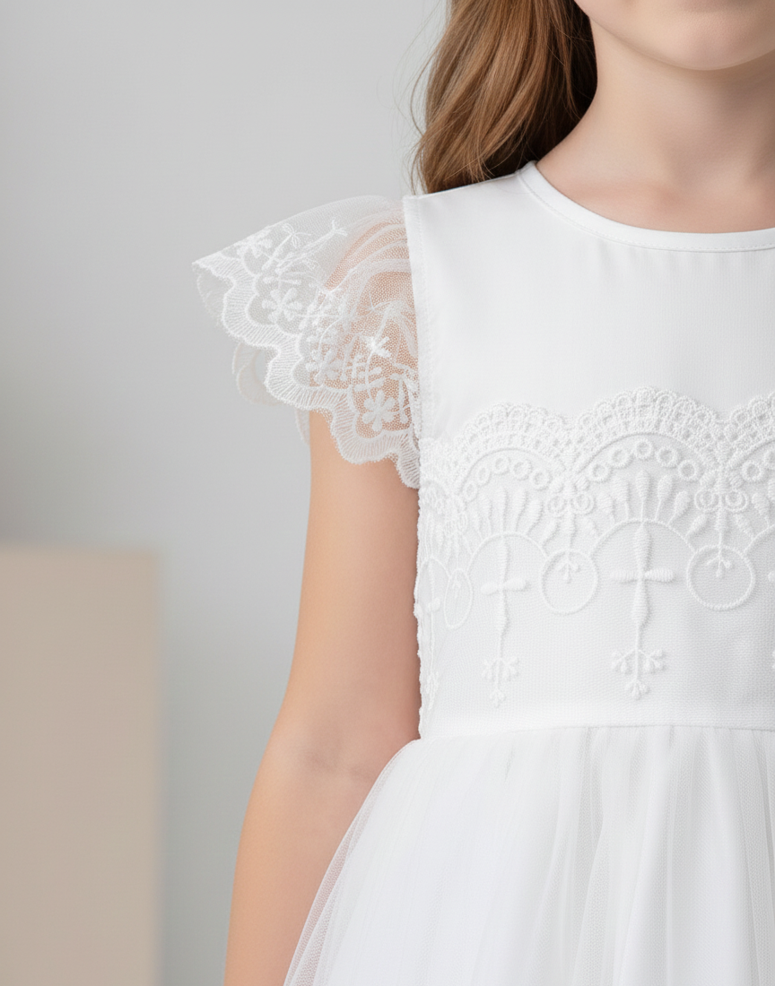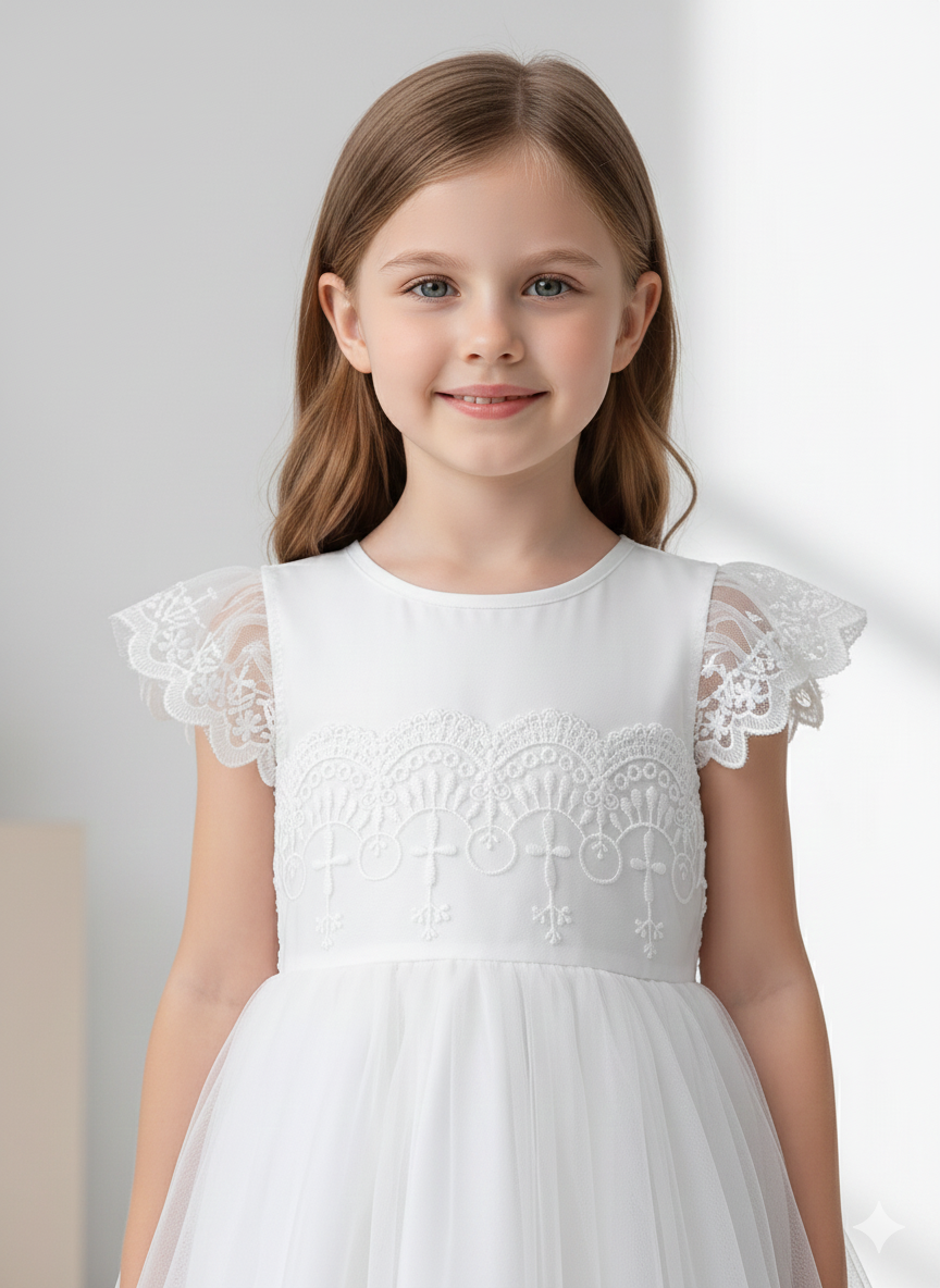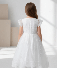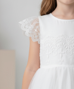 O vestido é decorado com um padrão bordado delicado e encantador em todo o tecido. Os bordado adicionam um toque primaveril e feminino ao visual da criança, trazendo uma sensação de frescor e elegância. A silhueta do vestido é solta e levemente acinturada, proporcionando conforto e liberdade de movimento para a criança. O comprimento ideal deste modelo é na abaixo do joelho.