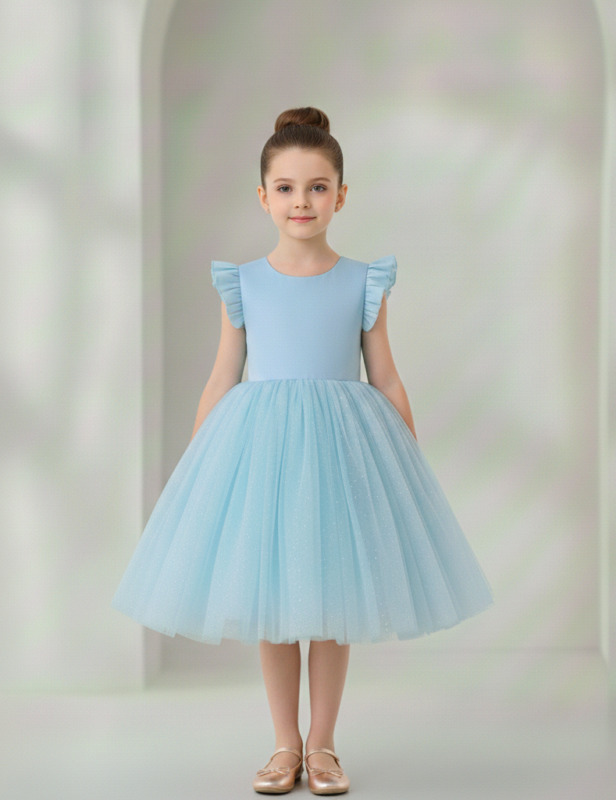 O vestido é decorado com tule encantador em todo o tecido, criando um visual encantador para uma criança. Além disso, o vestido apresenta o fechamento por botões zíper invisível, localizado nas costas. O Decote em V nas costas é um detalhe delicado que adiciona sofisticação e abertura ao vestido, complementando o estilo geral.
