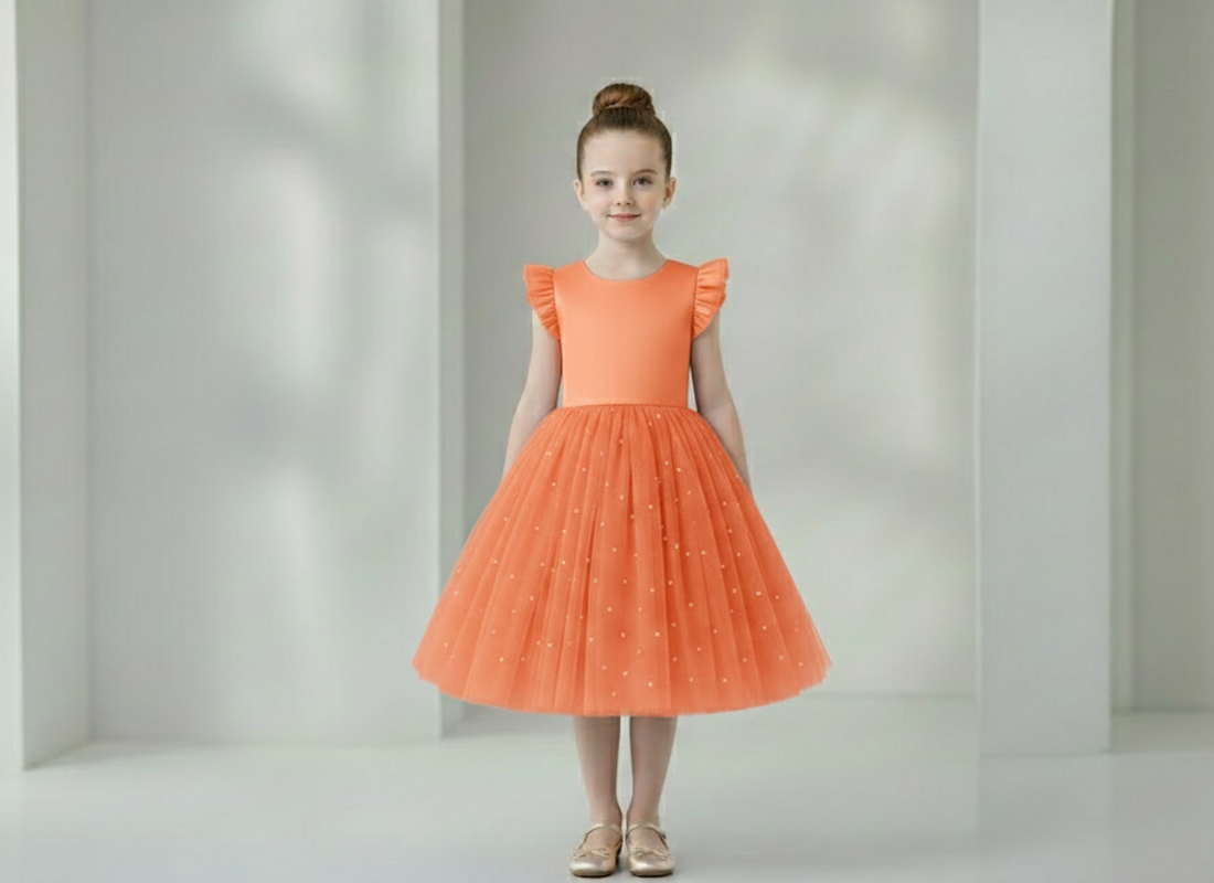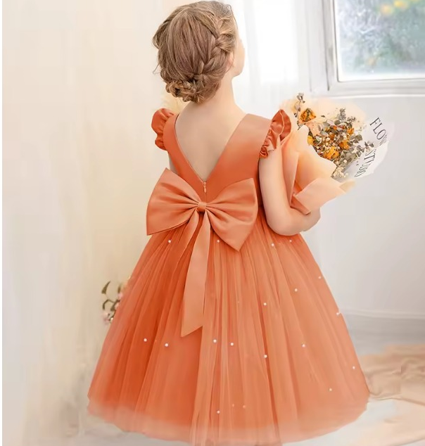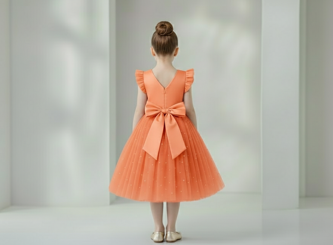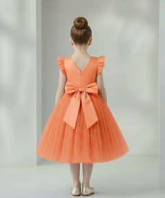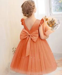 Vestido Infantil Melissa Laranja Coral em Cetim e Tule com Costas em V e Laço Elegante Festa Daminha Menina Premium Luxo