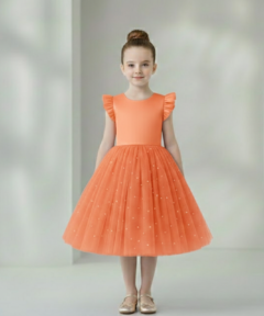 O vestido é decorado com tule encantador em todo o tecido, criando um visual encantador para uma criança. Além disso, o vestido apresenta o fechamento por botões zíper invisível, localizado nas costas. O Decote em V nas costas é um detalhe delicado que adiciona sofisticação e abertura ao vestido, complementando o estilo geral.