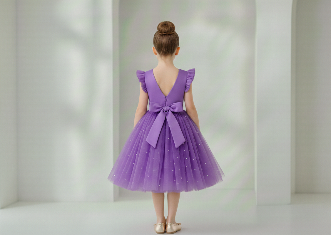 O vestido é decorado com tule encantador em todo o tecido, criando um visual encantador para uma criança. Além disso, o vestido apresenta o fechamento por botões zíper invisível, localizado nas costas. O Decote em V nas costas é um detalhe delicado que adiciona sofisticação e abertura ao vestido, complementando o estilo geral.