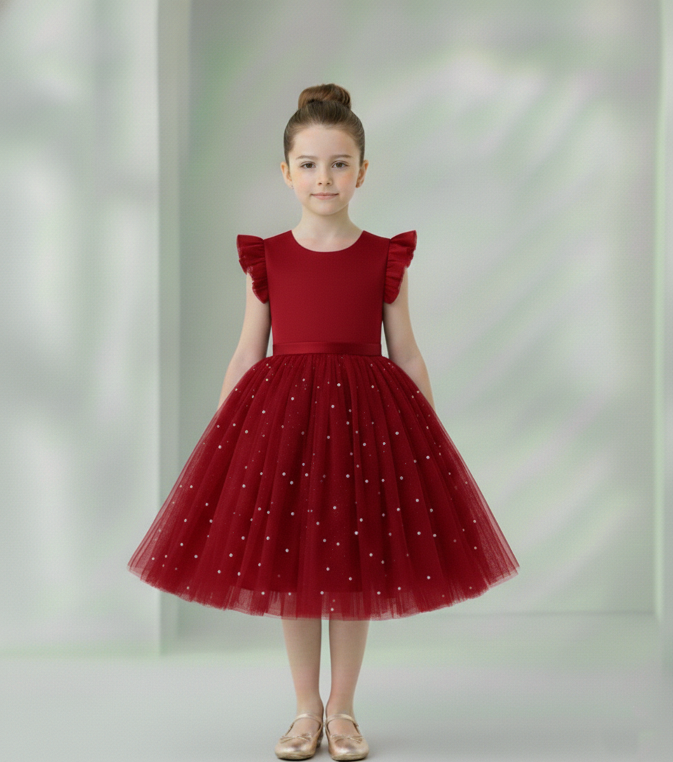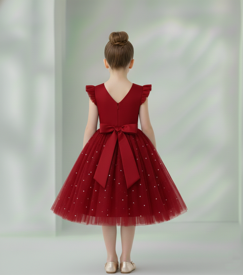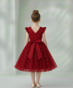 O vestido é decorado com tule encantador em todo o tecido, criando um visual encantador para uma criança. Além disso, o vestido apresenta o fechamento por botões zíper invisível, localizado nas costas. O Decote em V nas costas é um detalhe delicado que adiciona sofisticação e abertura ao vestido, complementando o estilo geral.