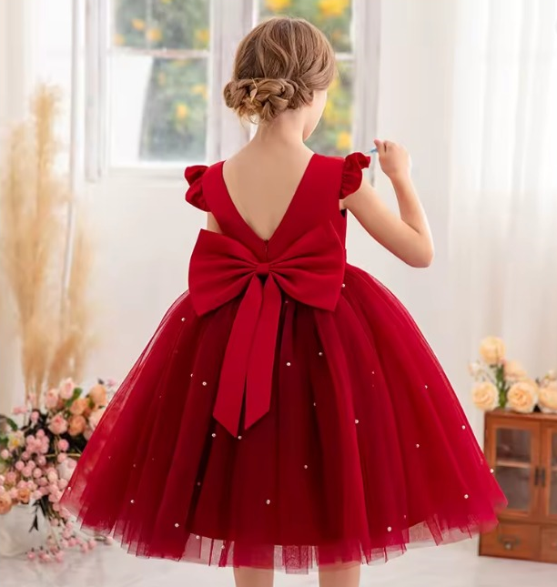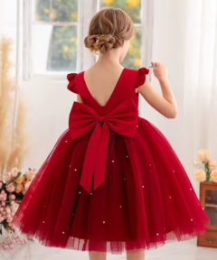 Vestido Infantil Melissa Vermelho em Cetim e Tule com Costas em V e Laço Elegante Festa Daminha Menina Premium Luxo