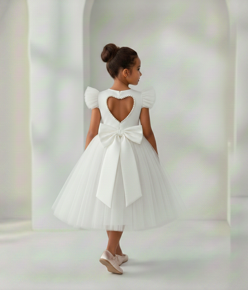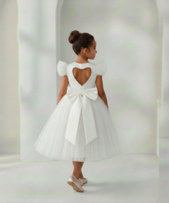 Vestido Infantil Naomi Branco em Cetim e Tule Costas com Coração e Laço Elegante Festa Daminha Menina Batizado Premium Luxo