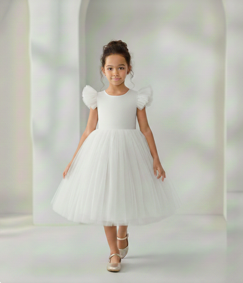 O vestido é decorado com tule encantador em todo o tecido, criando um visual encantador para uma criança. Além disso, o vestido apresenta o fechamento por botões em pérolas, localizado nas costas. O Decote em coração nas costas é um detalhe delicado que adiciona sofisticação e abertura ao vestido, complementando o estilo geral.