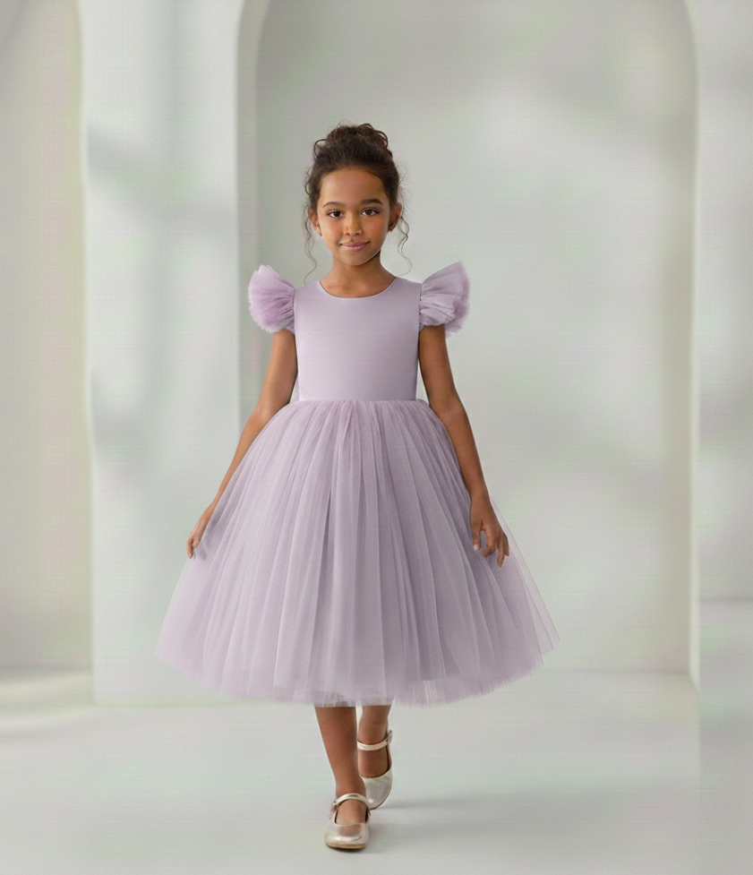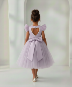 Vestido Infantil Naomi Lilás em Cetim e Tule Costas com Coração e Laço Elegante Festa Daminha Menina Premium Luxo
