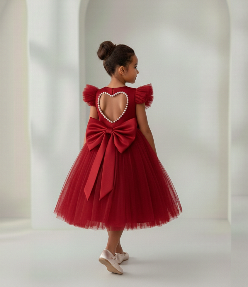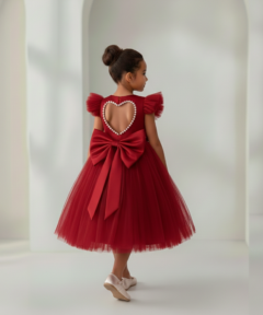 Vestido Infantil Naomi Vermelho em Cetim e Tule Costas com Coração e Laço Elegante Festa Daminha Menina Premium Luxo