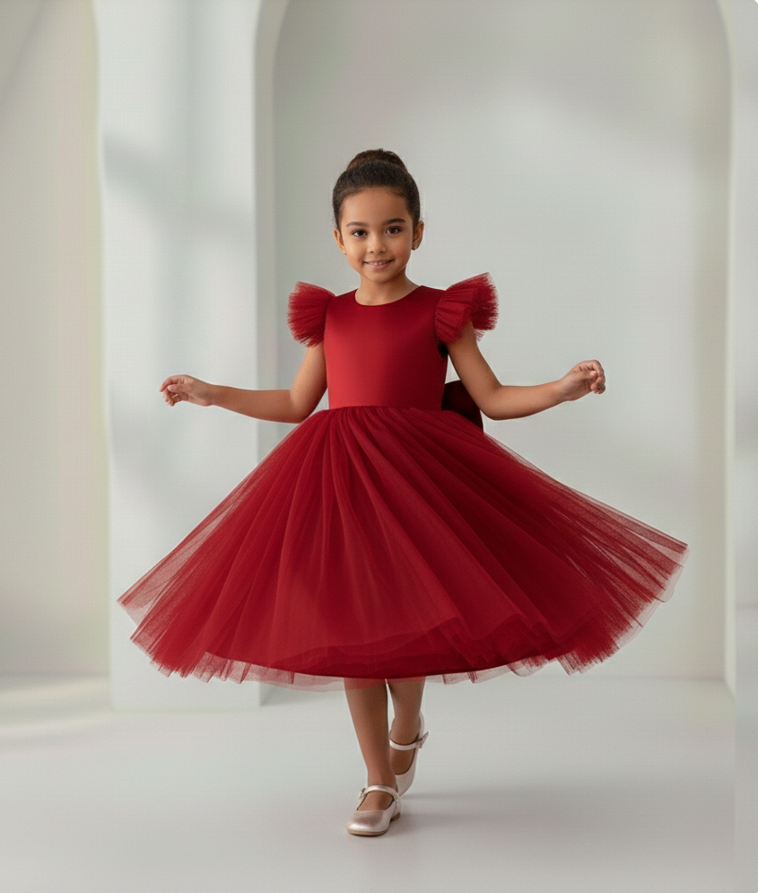A silhueta do vestido é justa e acinturada, proporcionando conforto e liberdade de movimento para a criança. O comprimento ideal é no do joelho, sendo modelagem curta. O vestido é confeccionado com materiais premium de alta qualidade, com forro em algodão cetim e tule, garantindo um acabamento refinado e durabilidade. Os detalhes são cuidadosamente trabalhados para criar um visual elegante e luxuoso.