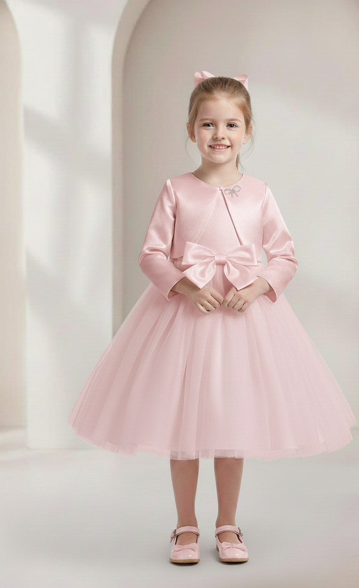 Vestido Infantil Zoe Rosa em Tule com Aplicação de Laço e Pérolas com Bolero em Cetim Elegante Infantil Menina Festa Daminha Premium Luxo